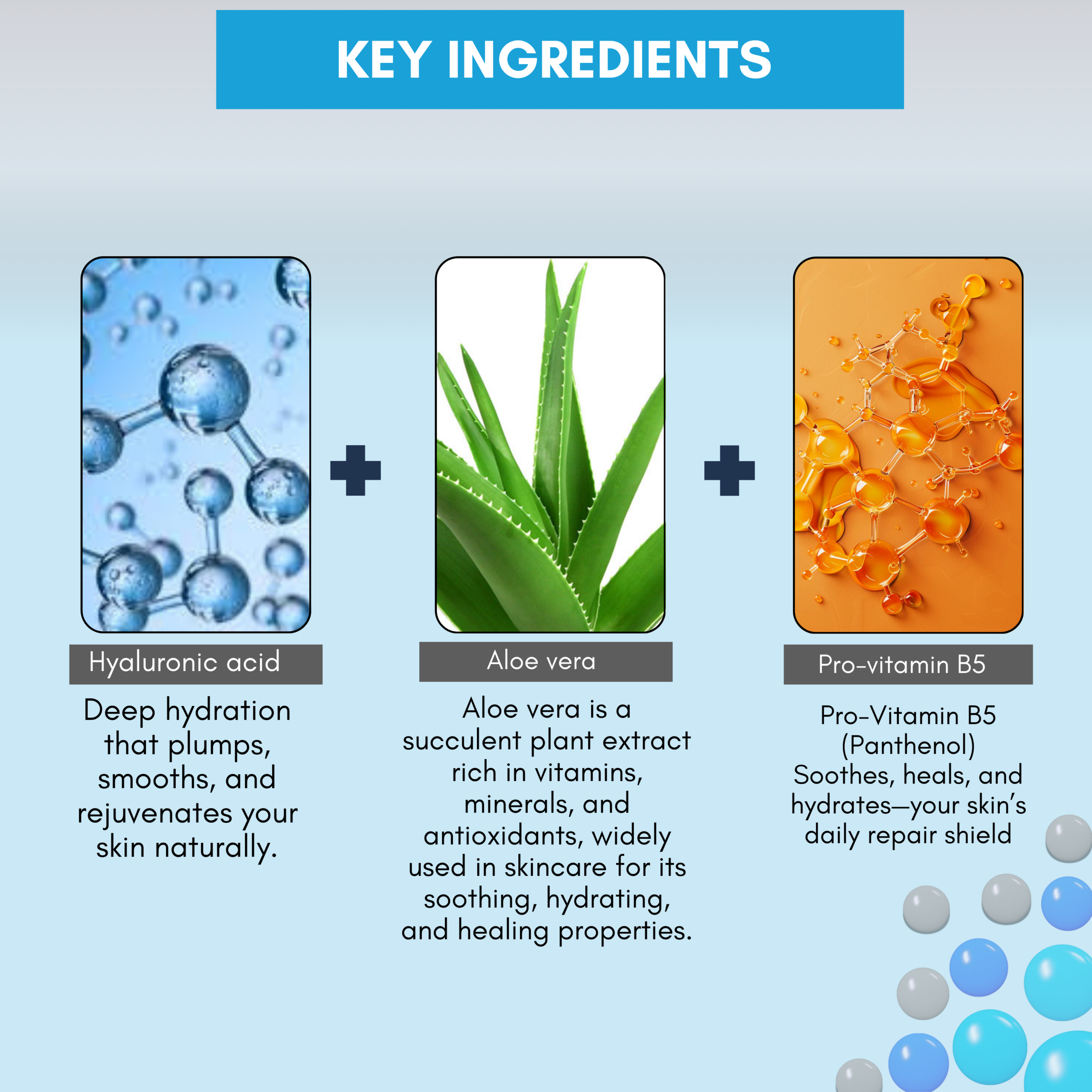 Aqua (Purified Water), Multi-Molecular Hyaluronic Acid (Sodium Hyaluronate – High MW, Hydrolyzed Hyaluronic Acid – Low MW, Sodium Acetylated Hyaluronate), Aloe Barbadensis Leaf Extract (Aloe Vera), Glycerin, Betaine, Panthenol (Pro-Vitamin B5), Allantoin, Citric Acid, Sodium Citrate, Sodium Benzoate, Potassium Sorbate.