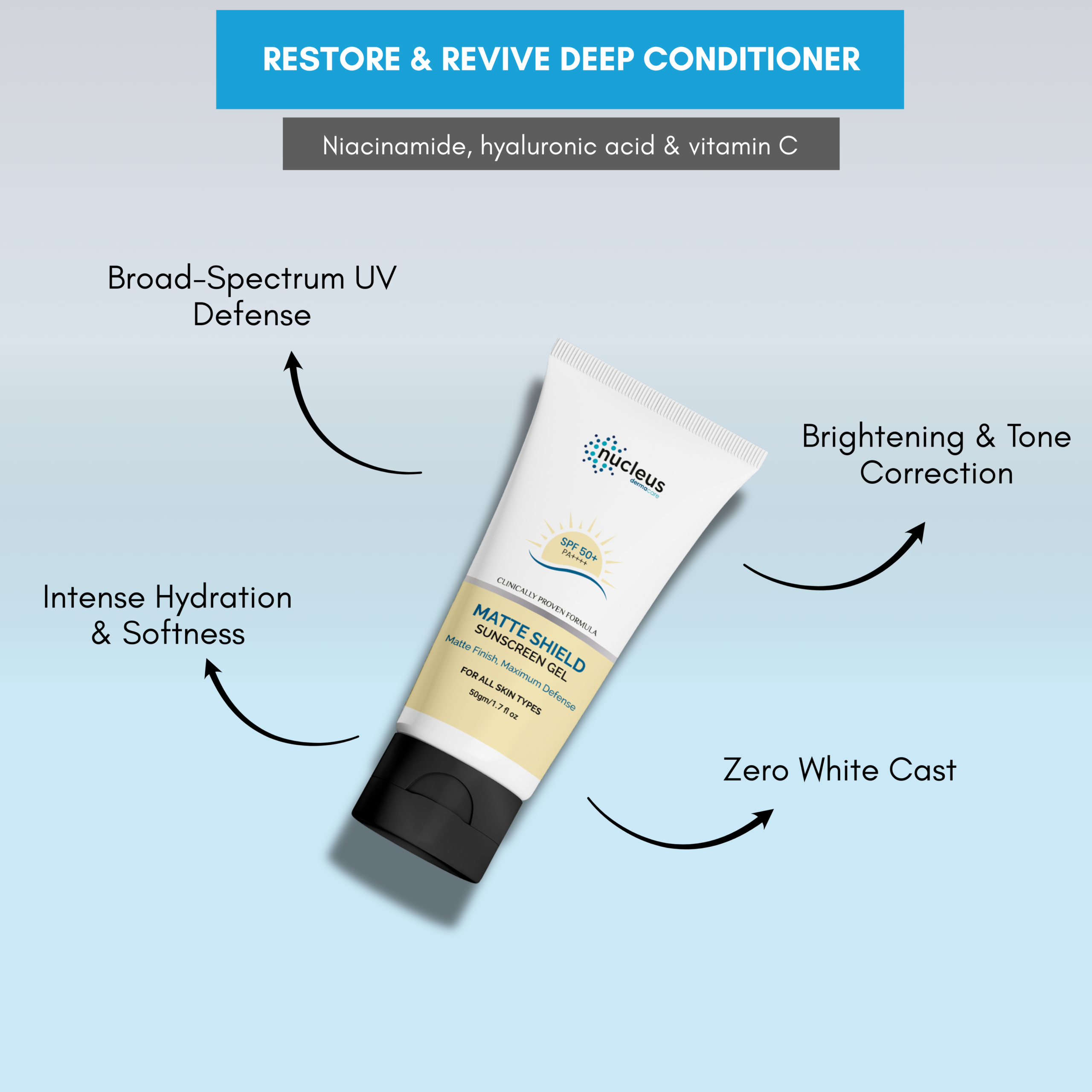 matte sunscreen india, gel sunscreen spf 50, no white cast sunscreen, niacinamide sunscreen, oily skin sunscreen, NucleusDermaCare SPF 50+
