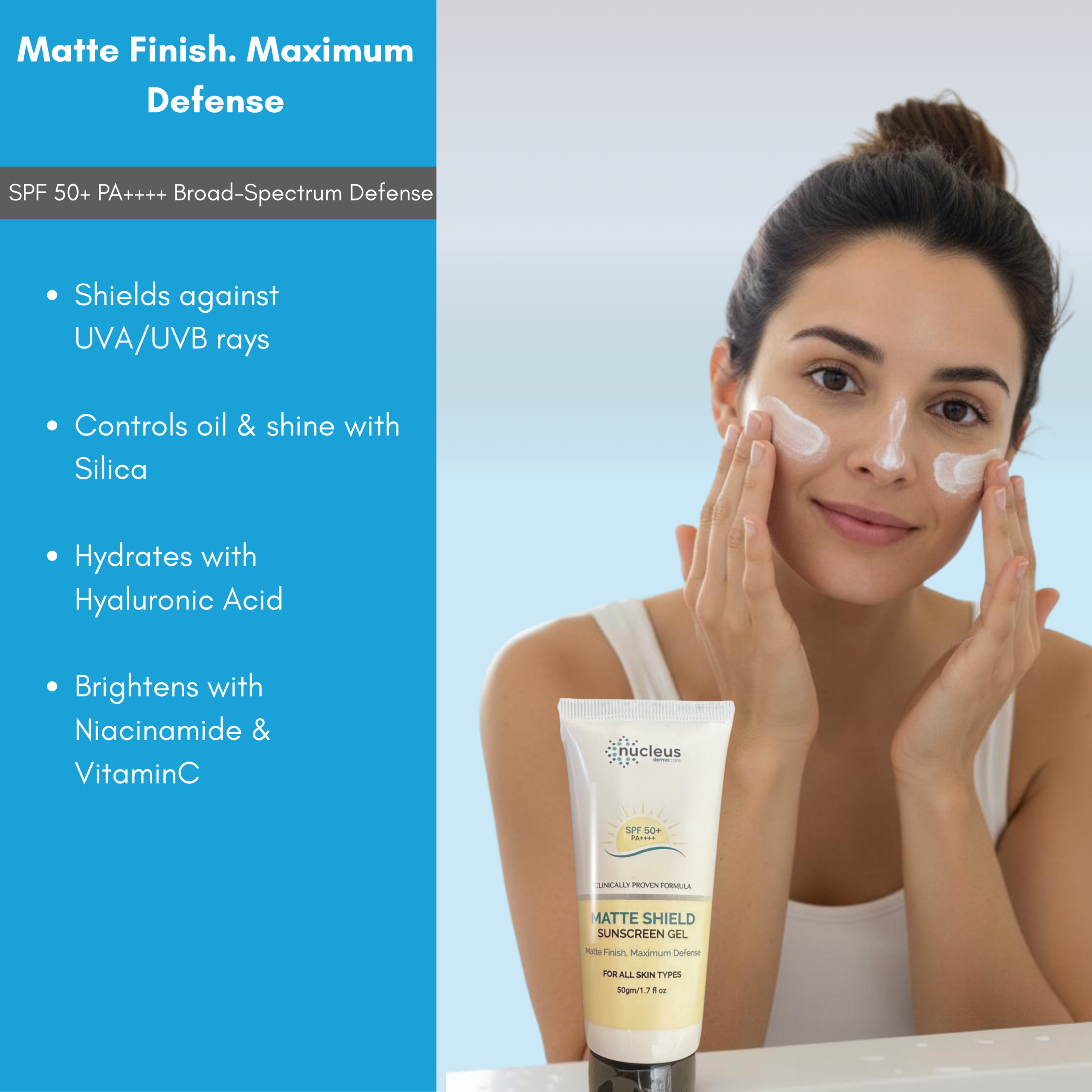 NucleusDermaCare Matte Shield Sunscreen Gel SPF 50+ | Matte Finish, No White Cast | Vitamin C & Niacinamide Sun Protection