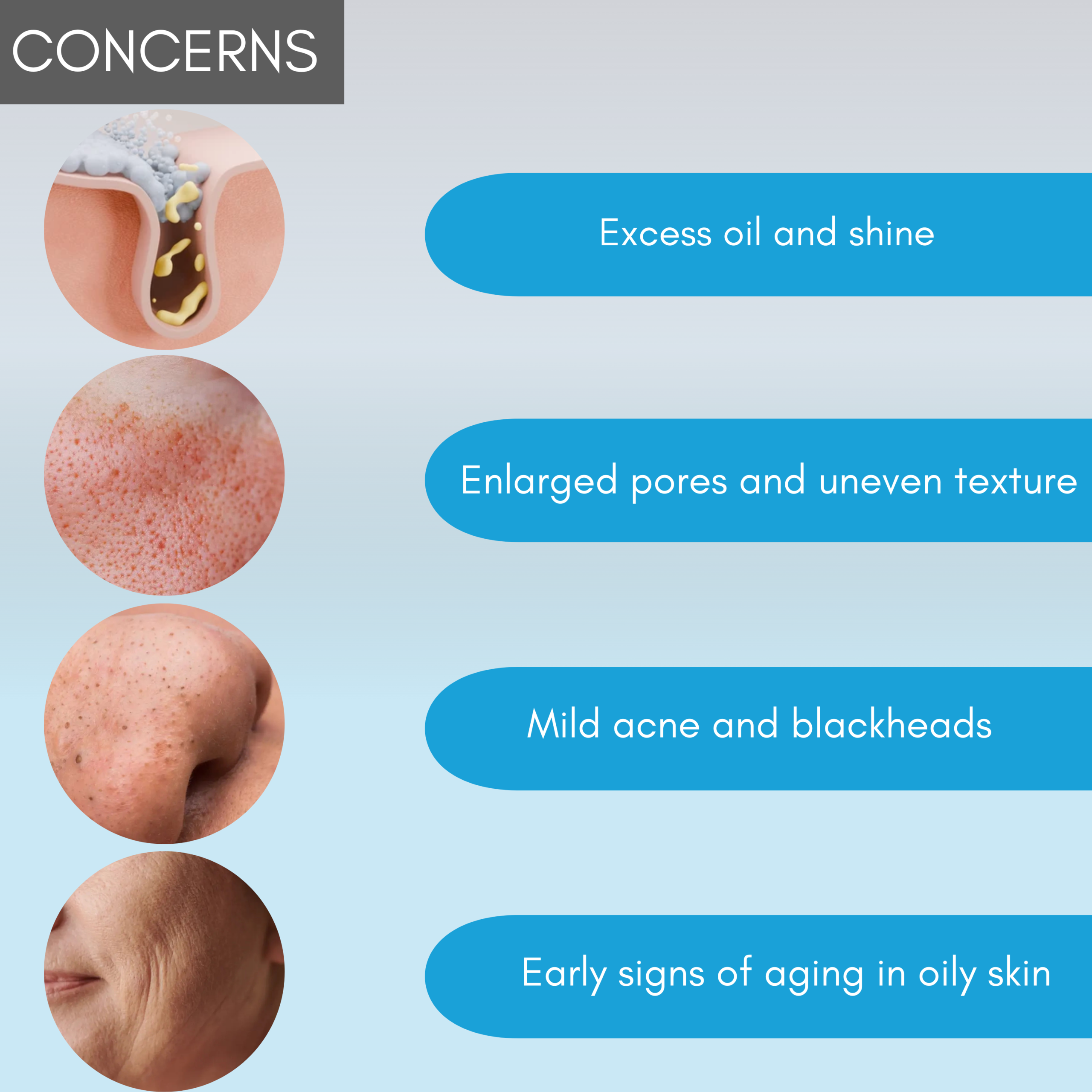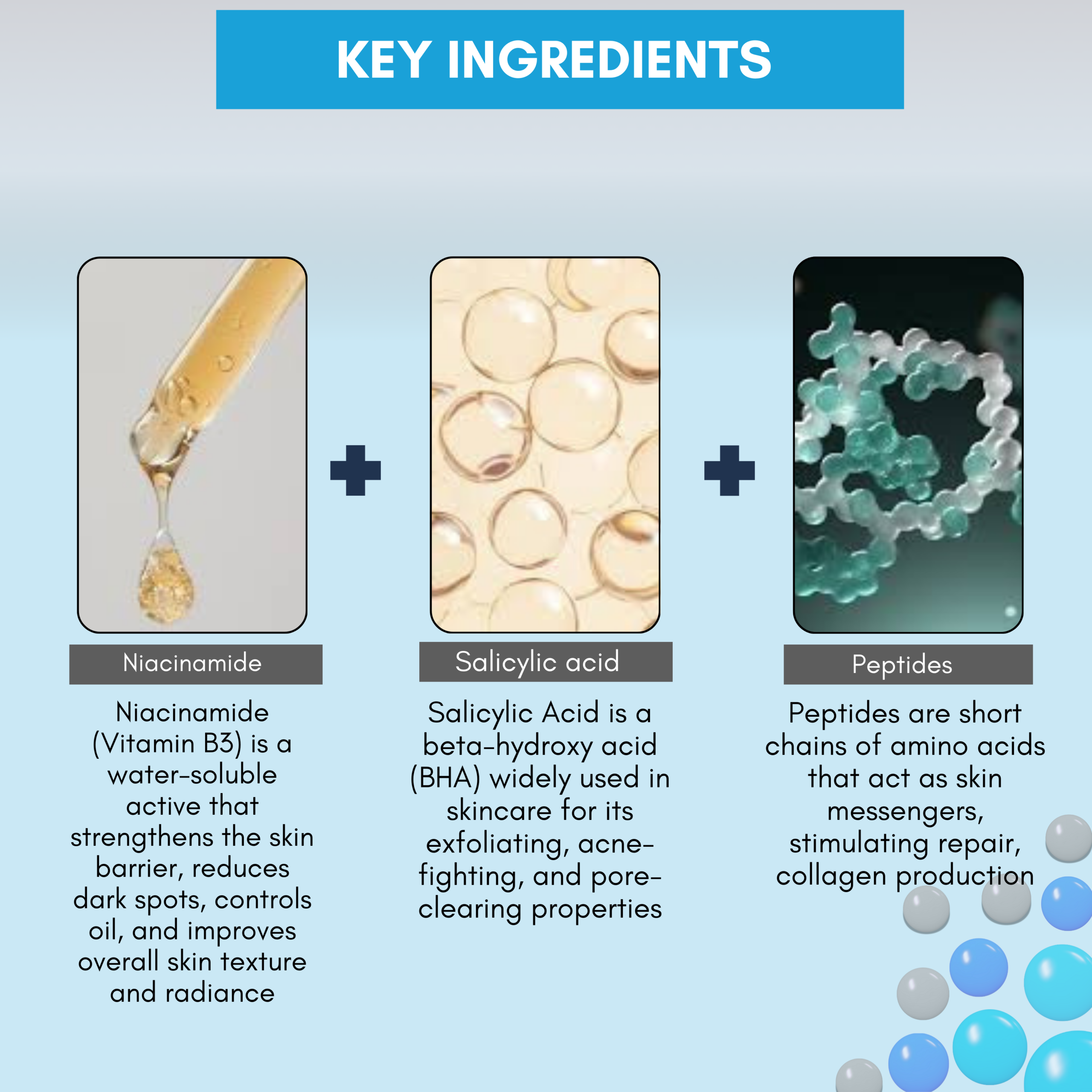 Aqua, Niacinamide, Salicylic Acid (Lower Concentration), Mattifying Agents (Natural Silica / Clays), Peptides, Glycerin, Herbal Extracts, Emollients, Xanthan Gum, Natural Preservatives, Fragrance.